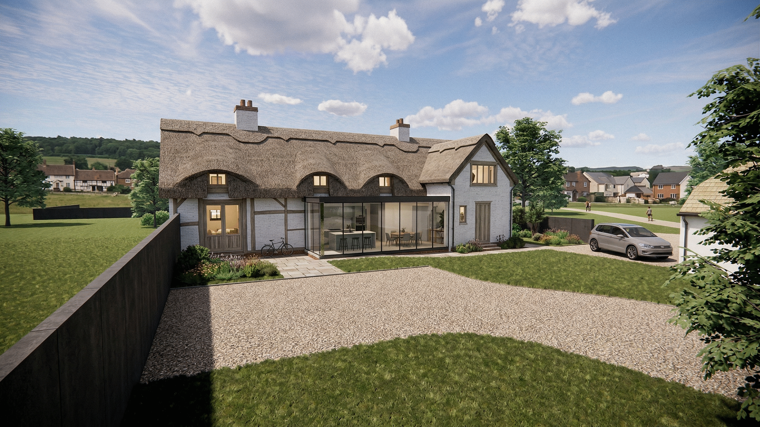 70 Main St is a timber-framed Grade II listed property in Alrewas. The client’s brief included replacing the tiled roof to thatch (it would have been thatch in its original form) and creating a glazed extension to the rear to remove the incongruous 1970s addition bays.